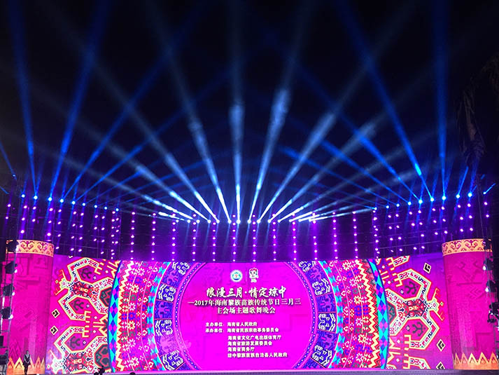 今晚(農(nóng)歷三月初三),由海南省人民政府主辦,海南省民族宗教事務(wù)委員會(huì)、海南省文化廣電出版體育廳、海南省旅游發(fā)展委員會(huì)、海南省商務(wù)廳、瓊中黎族苗族自治縣人民政府承辦,以“浪漫三月·情定瓊中”為主題的2017年海南黎族苗族傳統(tǒng)節(jié)日三月三主會(huì)場活動(dòng)在瓊中三月三廣場隆重開幕。浩洋電子自主研發(fā)特寶麗品牌近500臺高品質(zhì)專業(yè)舞臺燈光產(chǎn)品:全能王三合一G9 HYBRID、切割燈V3000P、光束燈G9B、染色燈V1500TW、大光束燈V1500TB、防水固定染色燈OVAL 60D等炫耀擔(dān)任瓊中主會(huì)場舞臺燈光主力,為今年海南“三月三”民俗節(jié)慶晚會(huì)傾力獻(xiàn)力。