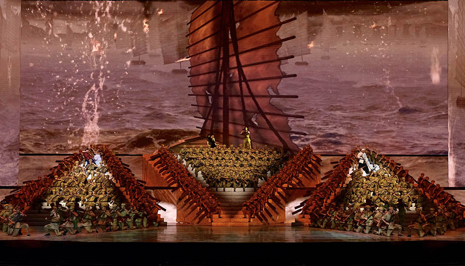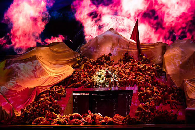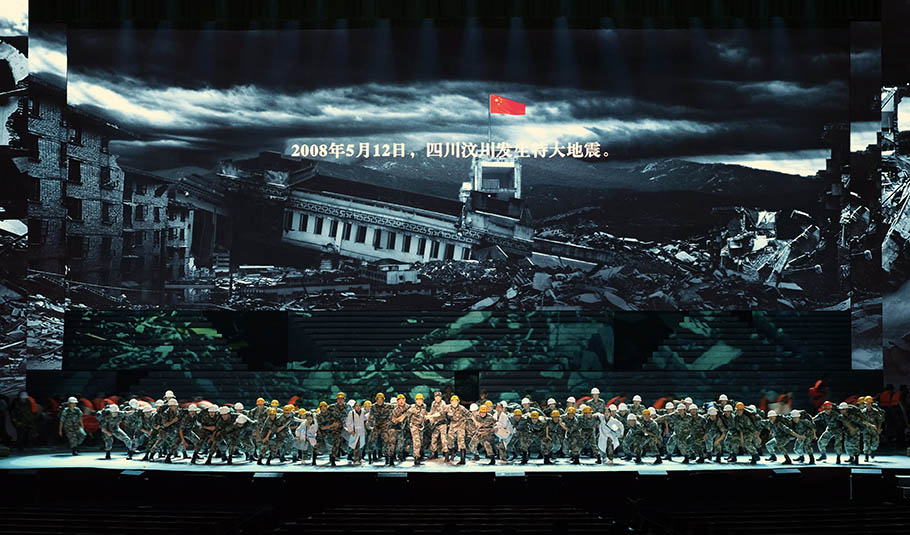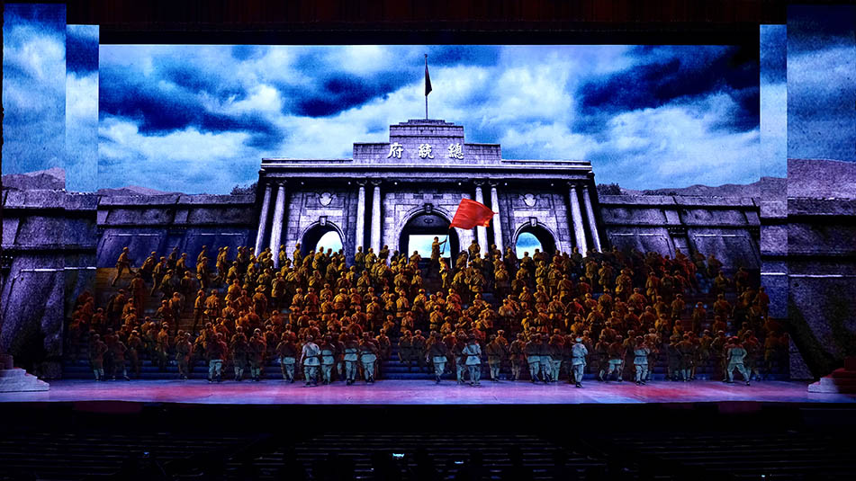 舞臺上舞美布景與燈光、視頻、投影等舞臺視覺形式的有機融合是晚會的亮點與難點。如此豪邁氣概的演出得益于晚會陣容強大的幕后團隊:總導演楊笑陽、舞美總設計孫天衛(wèi)、燈光總設計沙曉嵐、音頻總設計何飚再加上其他行業(yè)精英成員強強聯(lián)合,以舞美、燈光、音響、投影、視頻、舞臺機械等多種舞臺手段,呈現(xiàn)出恢弘壯麗的舞臺效果。